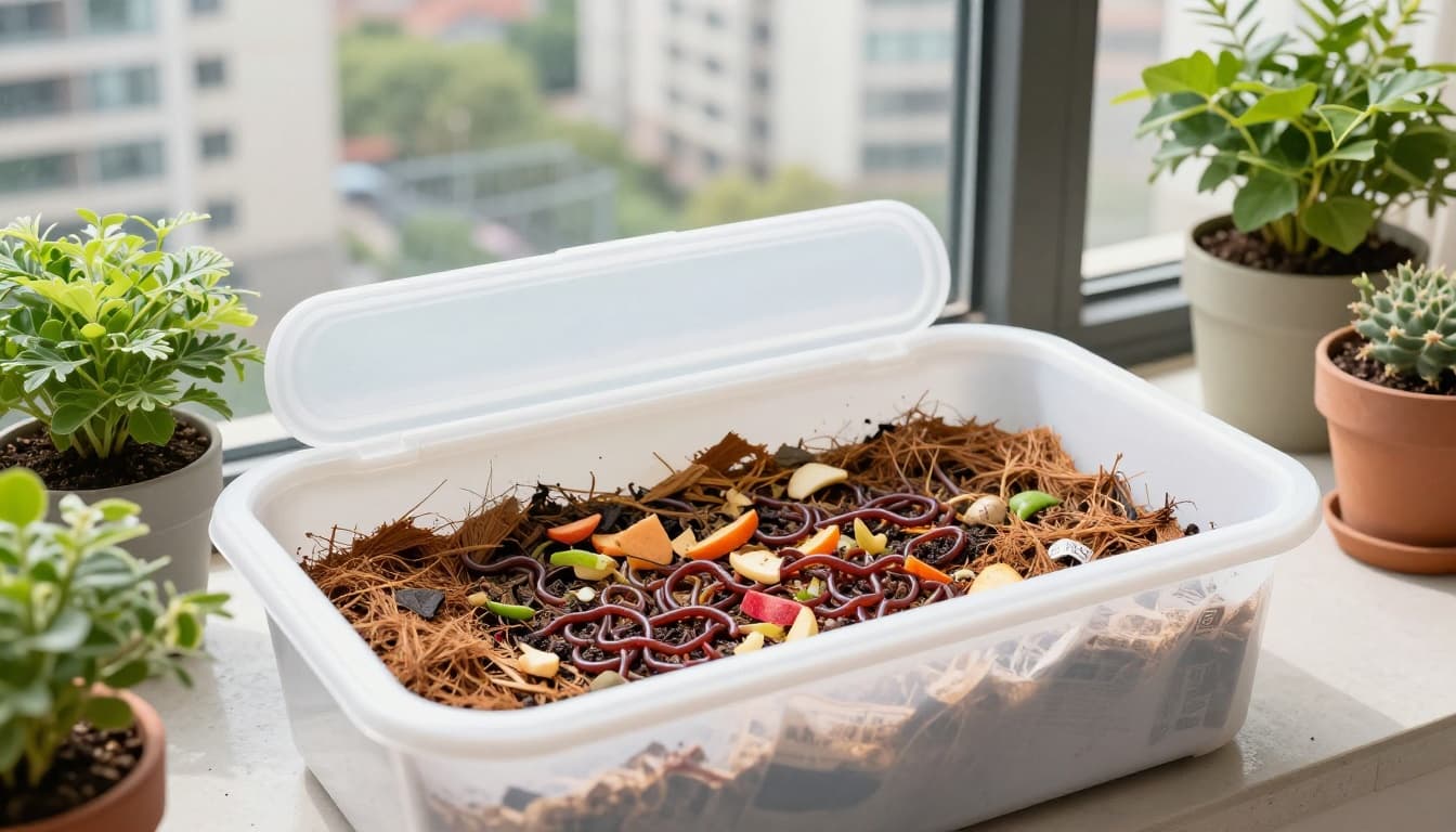 Een wormenbak op een balkon, waar wormen groente- en fruitresten verwerken,