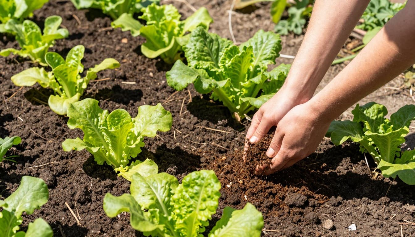 Rijpe compost die als donkere kruimels rond groenteplanten wordt verdeeld,